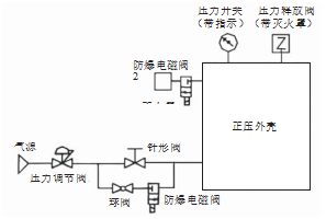 在正壓通氣型中,保護氣體持續(xù)流過正壓外殼并保持一定的流量,從而正壓外殼的壓力保持在工作壓力范圍內。正壓補償型不需要持續(xù)通風。控制系統(tǒng)實時檢測正壓外殼的壓力,電磁閥控制保護氣體的流入和流出。當正壓外殼壓力過低時,打開進氣電磁閥補充空氣,使壓力上升到工作壓力范圍;當正壓外殼壓力過高時,打開排氣電磁閥進行排氣,使壓力降至工作壓力范圍。